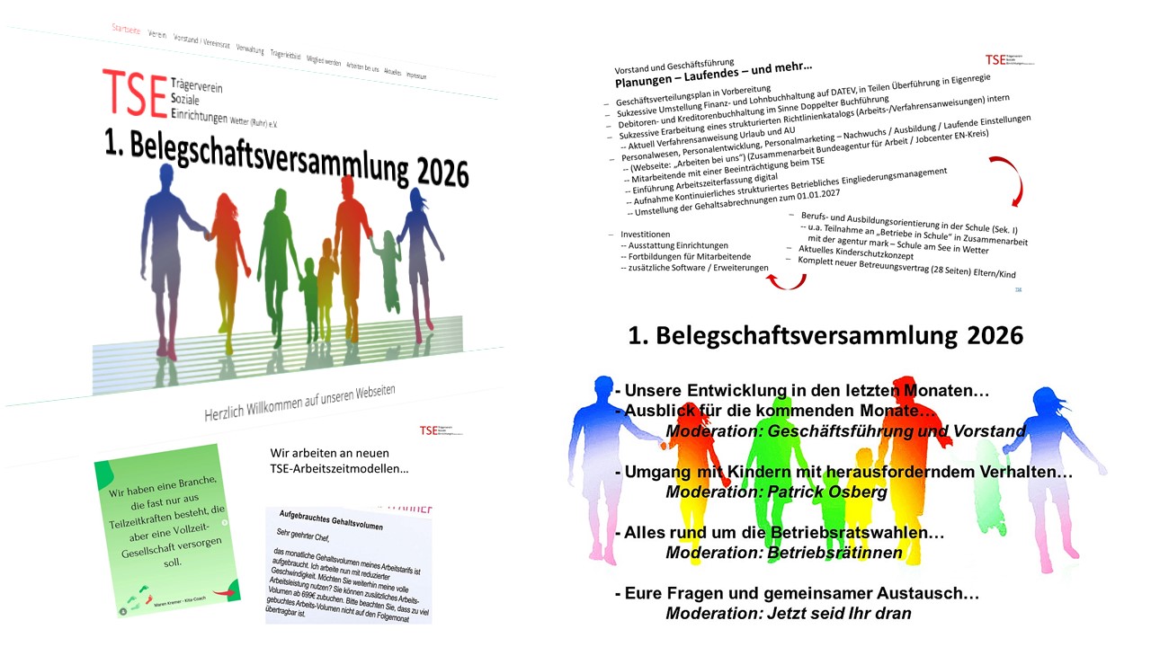 Am 25.03.2026 fand in diesem Jahr, als Novum beim TSE, erstmalig eine Belegschaftsversammlung statt. Themen, moderiert im Wechsel von Vorstand, Geschäftsführung und Betriebsrat, waren neben der Entwicklung der vergangenen Monate und einem Ausblick auf die kommenden Monate Informationen zu den anstehenden Betriebsratswahlen, Fachliches zum Umgang mit Kindern mit herausforderndem Verhalten sowie ein abschließender gemeinsamer Austausch zu Fragen aller Anwesenden.