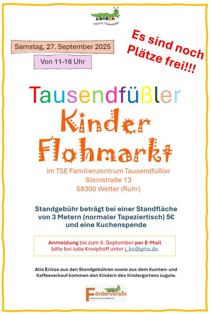 Am Samstag, 27.09.2025, startet unser "Tausendfüßler – Kinder Flohmarkt". Noch haben wir einige Standplätze zu vergeben. Nutzen Sie doch einfach die Gelegenheit von Ihnen nicht mehr benötigte Kindersachen bei uns zu verkaufen. Wir freuen uns riesig auf alle, die sich beteiligen.